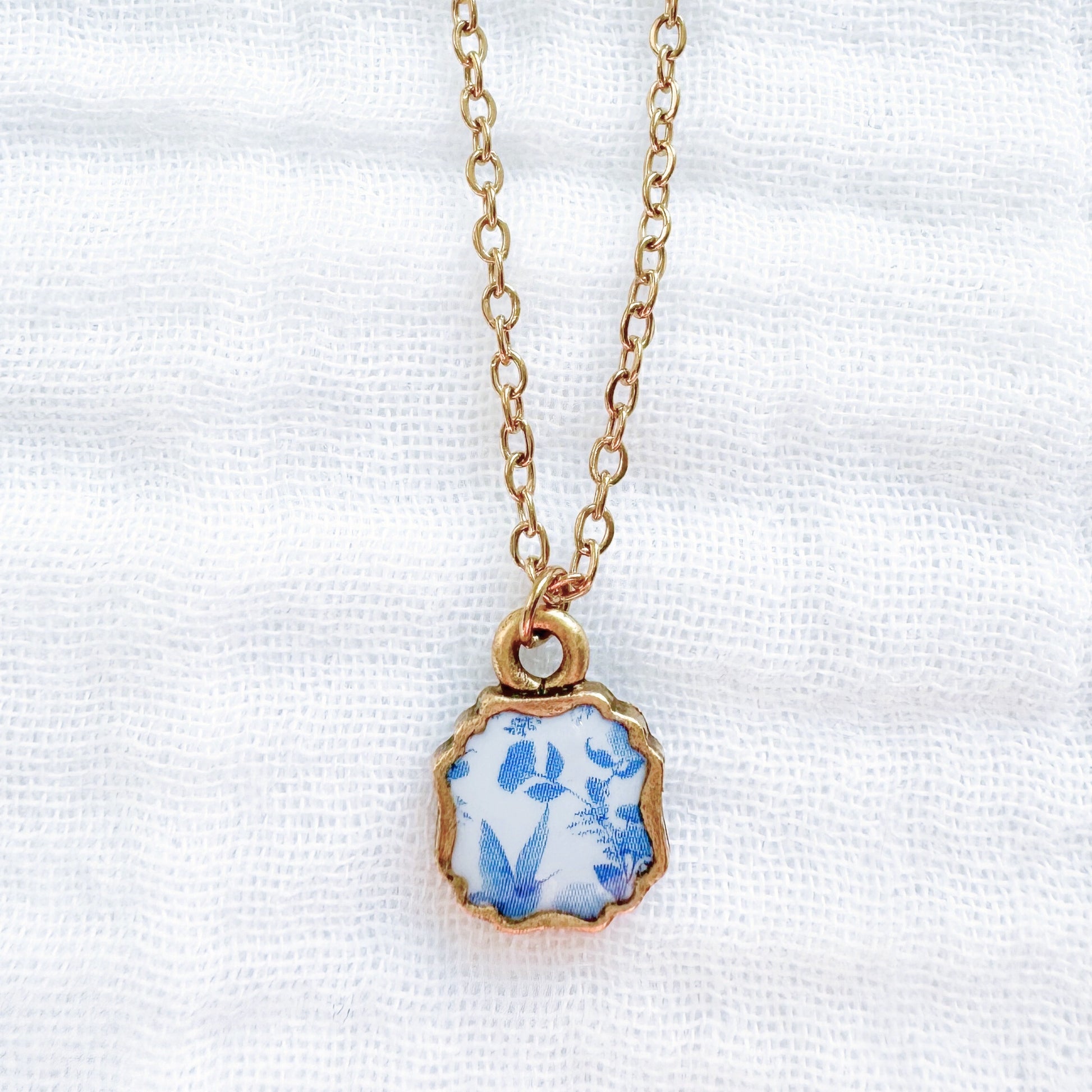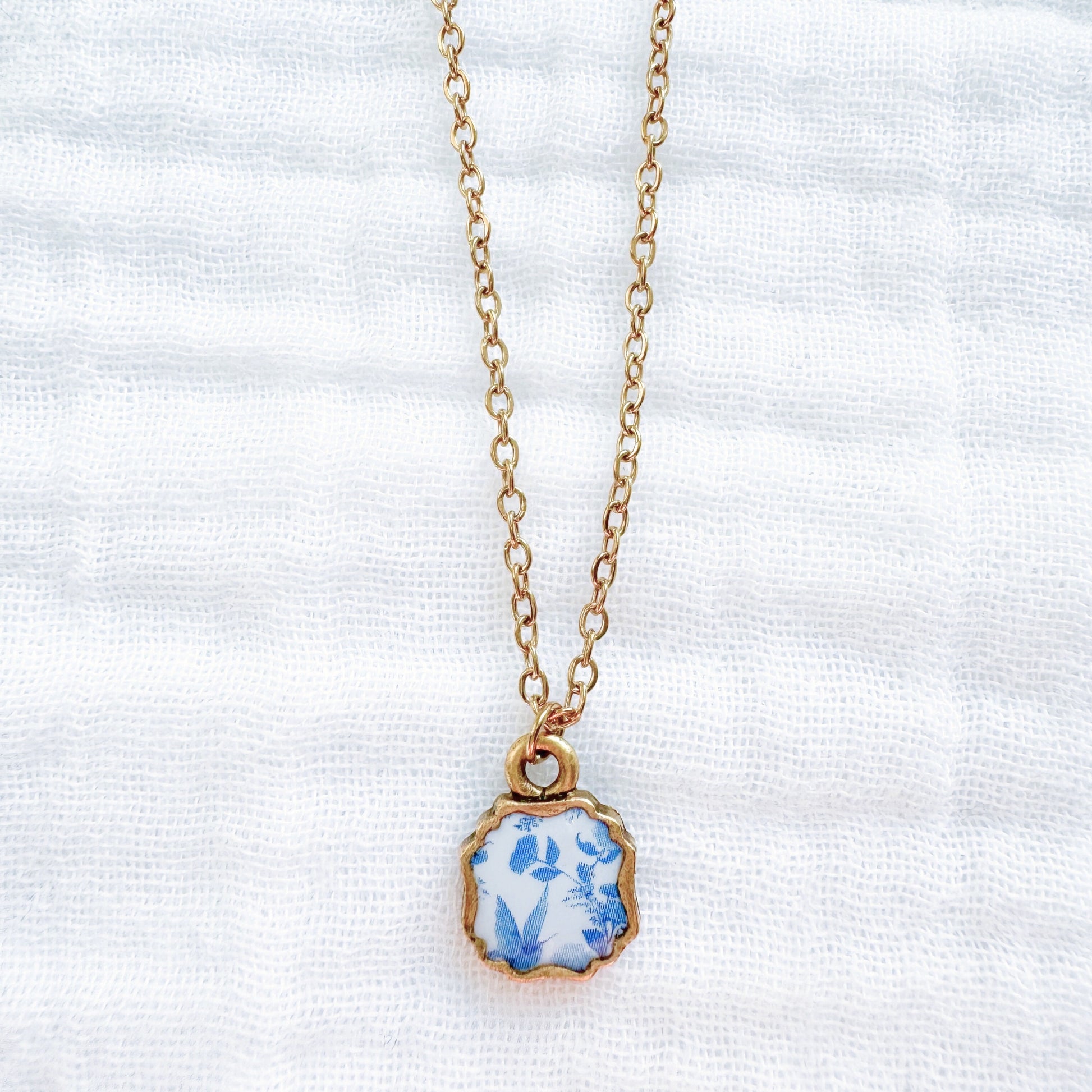 A dainty floral necklace featuring a sky blue toile pattern with flowers and birds, housed in an elegant, antique style pendant.