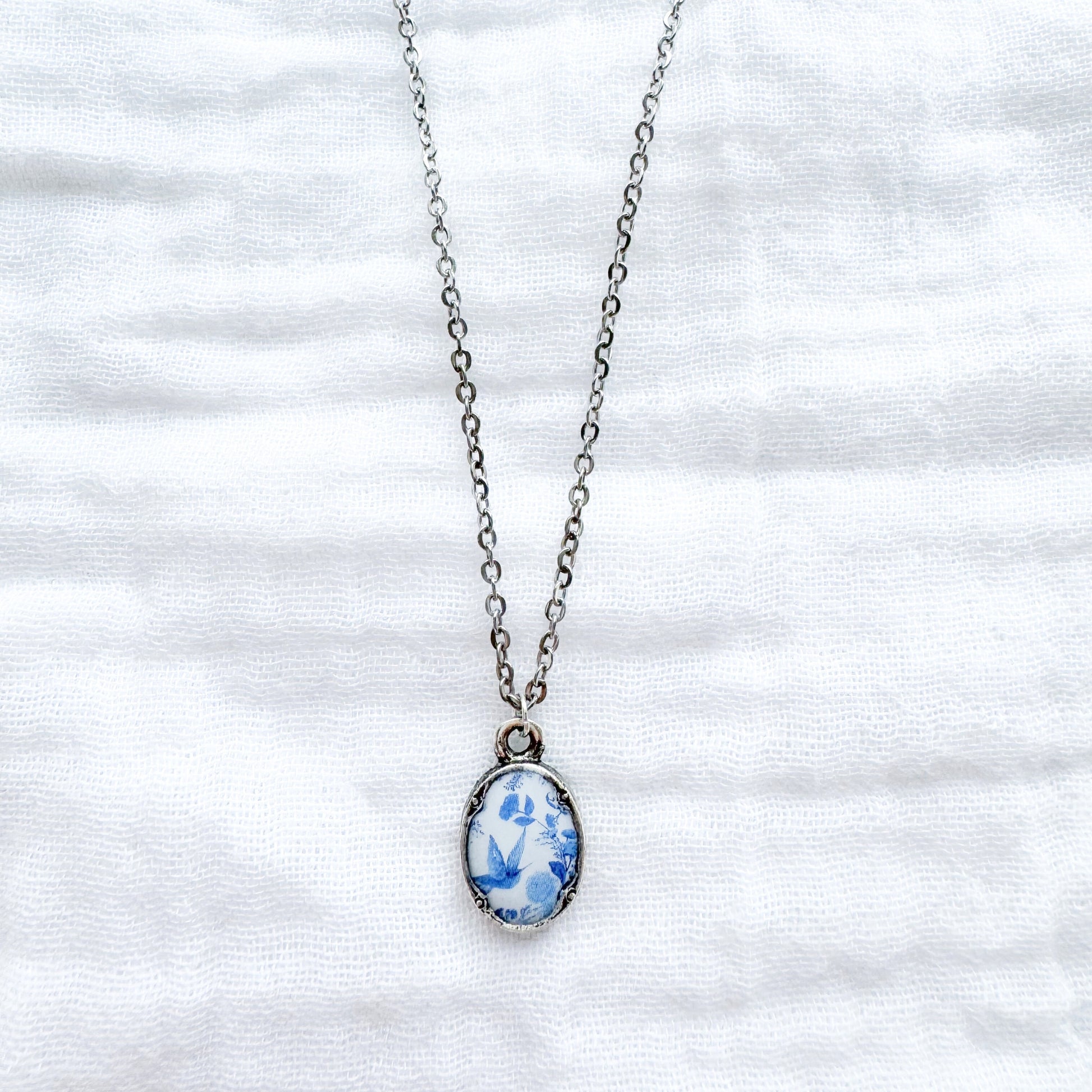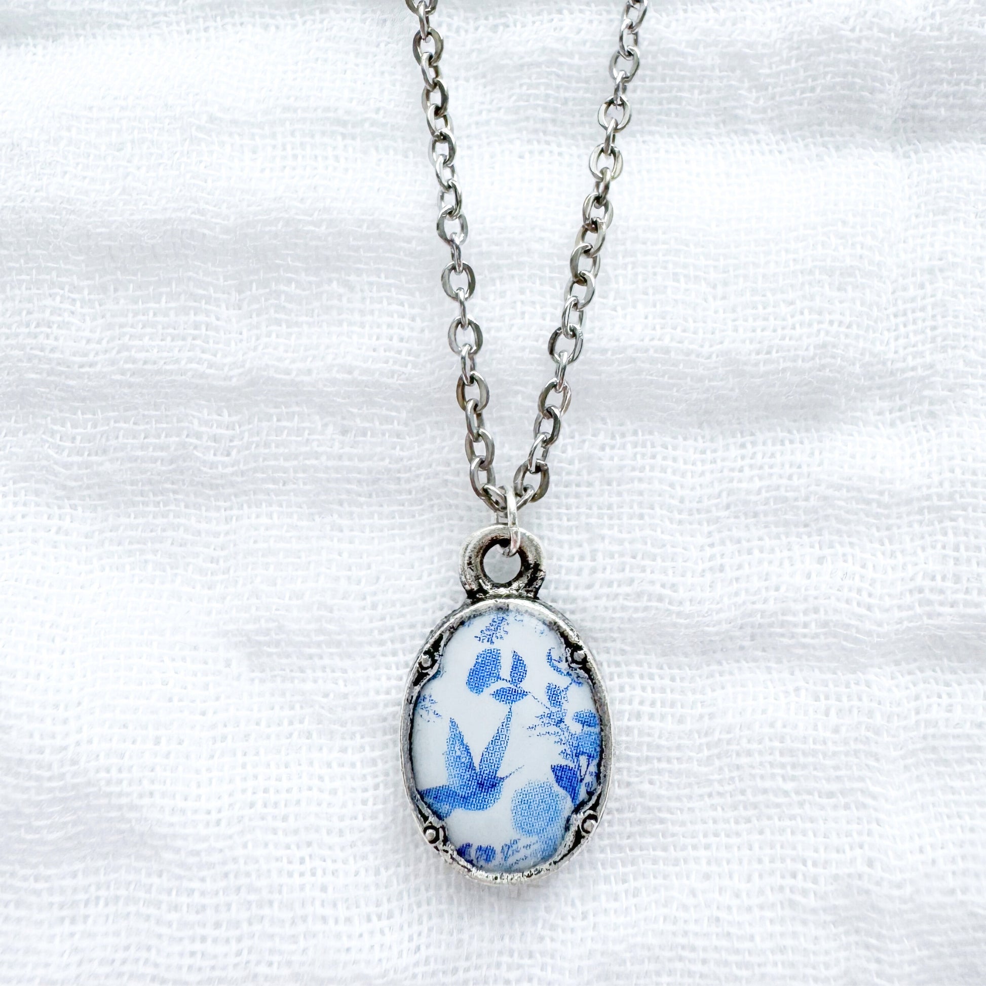 A dainty floral necklace featuring a sky blue toile pattern with flowers and birds, housed in an elegant, antique style pendant.