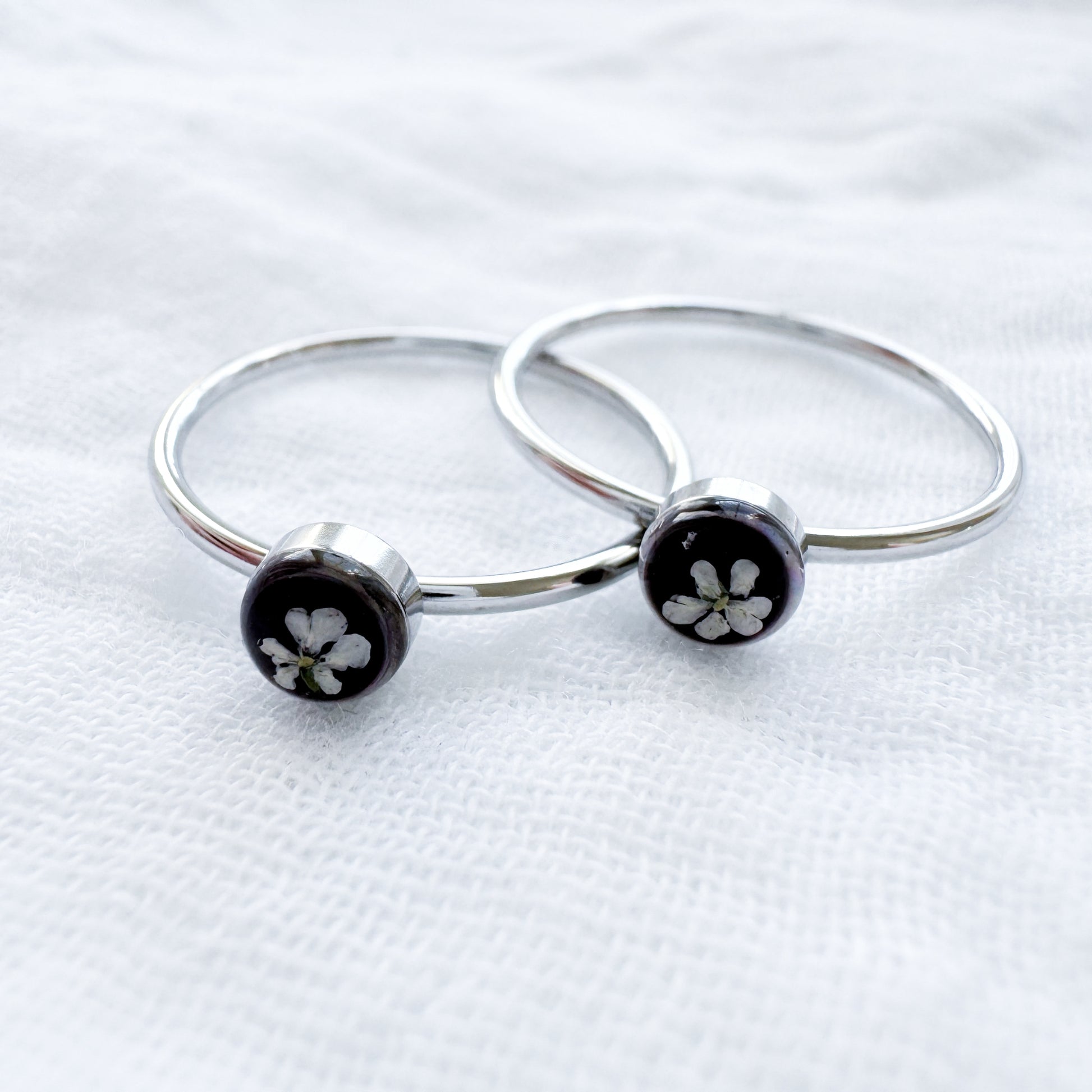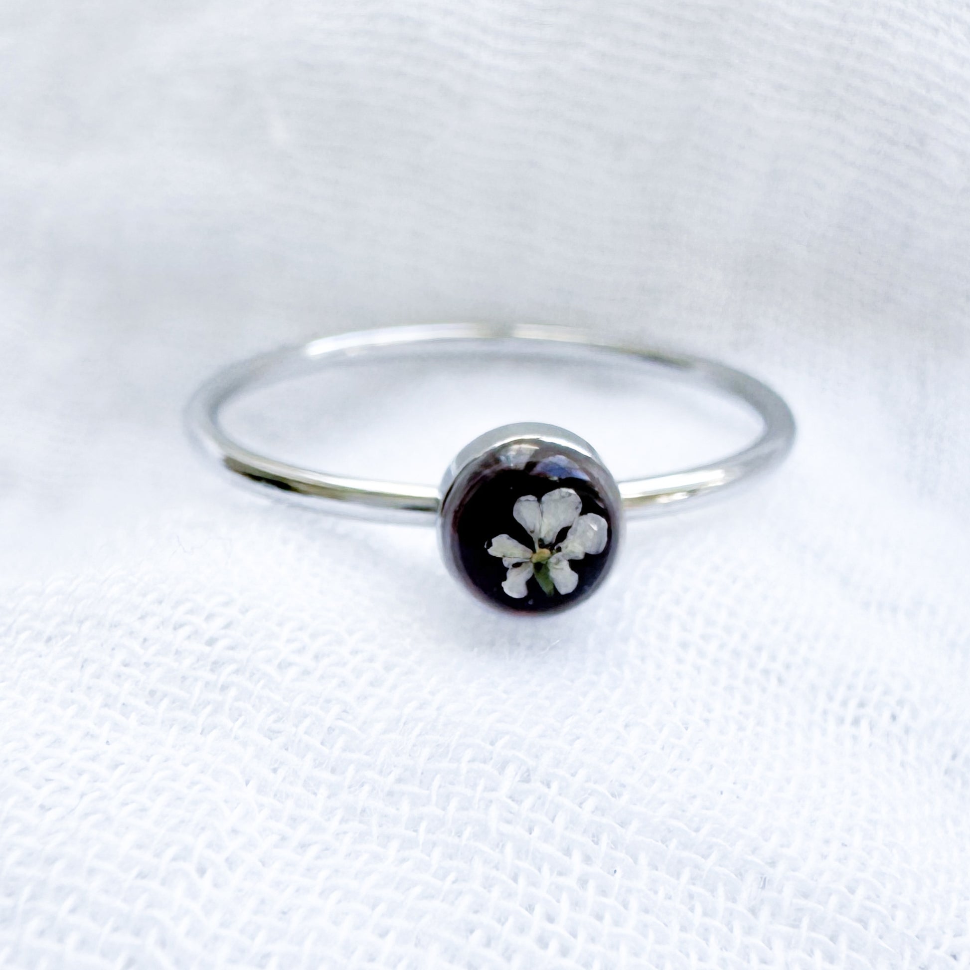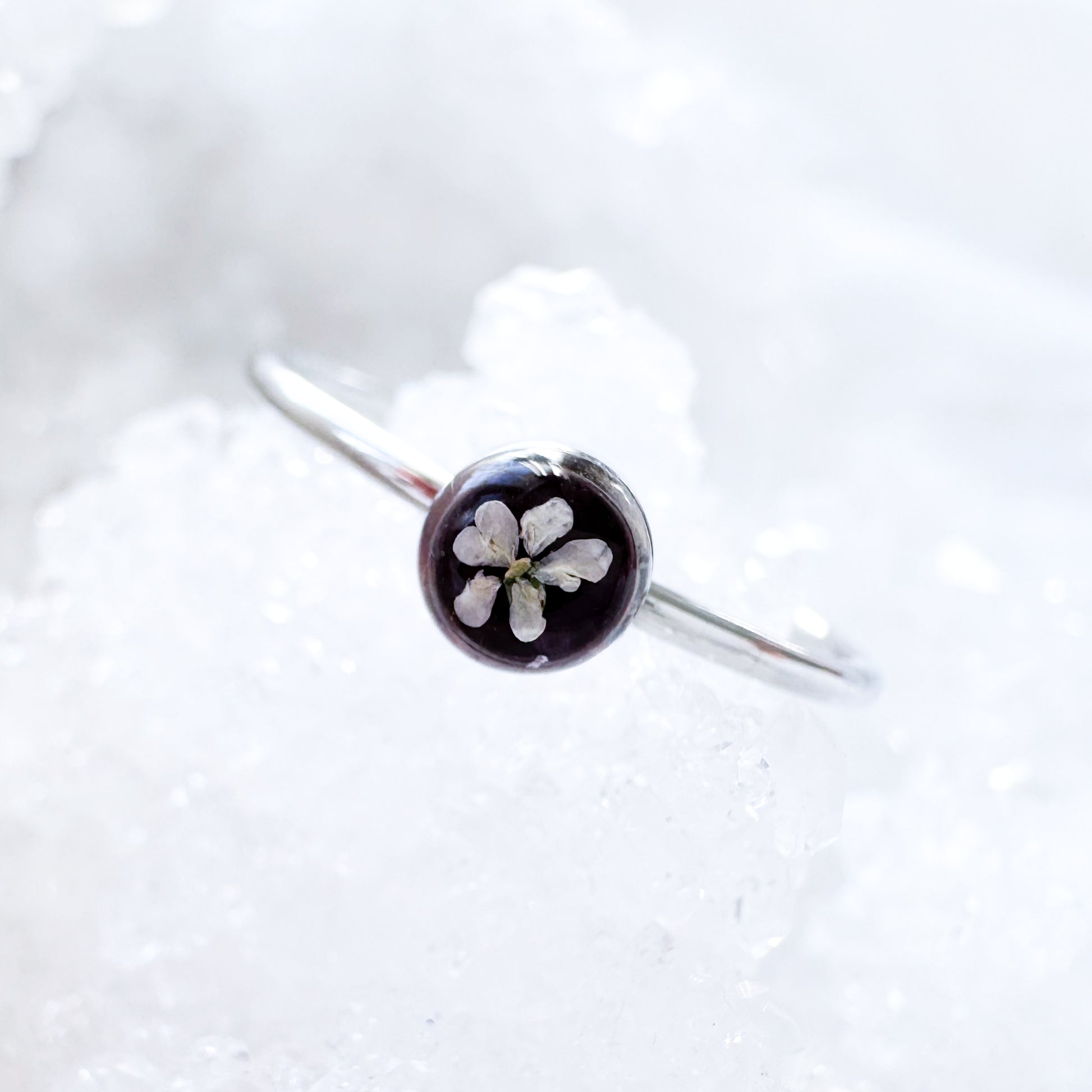 This dainty pressed flower stacking ring features a single delicate Queen Anne's lace bloom cast against a dark violet backdrop. These real pressed petals are housed in a classic solitaire setting.