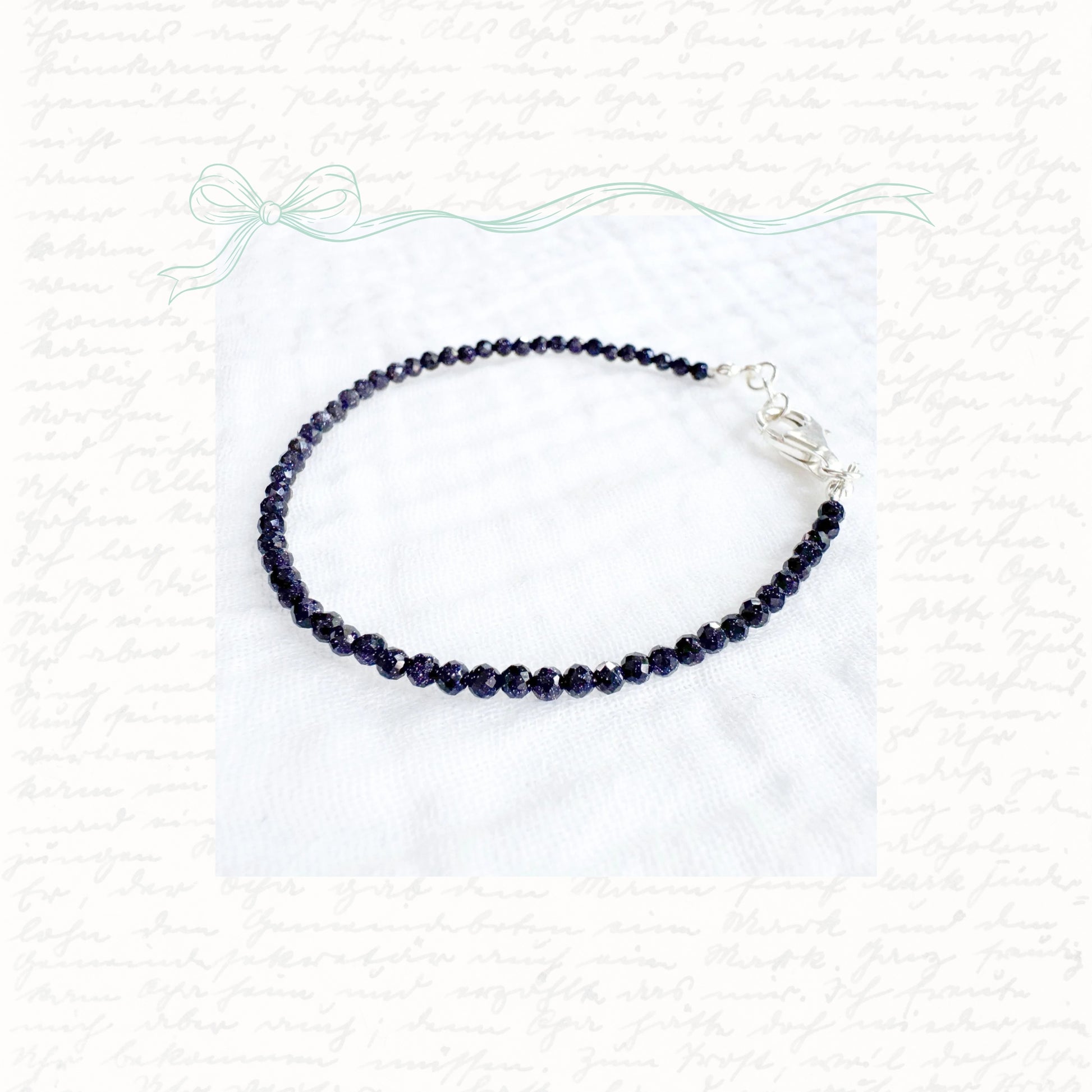 This gorgeous bracelet is made with diamond-faceted blue sandstone beads. Blue goldstone glass is infused with tiny cobalt or manganese particles, creating a deep midnight blue with bright, starry flecks.