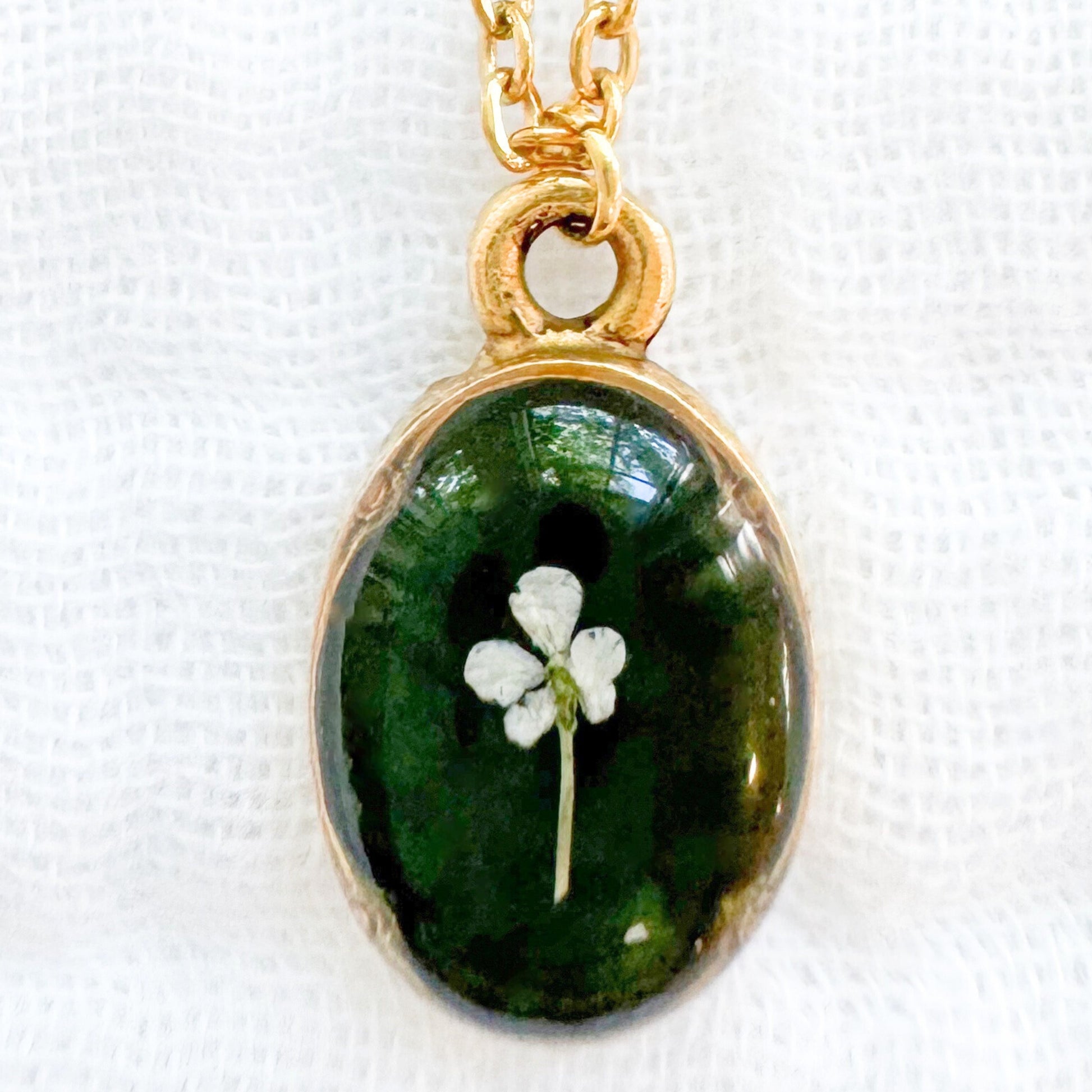 A dainty pressed flower necklace featuring a delicate Queen Anne's lace bloom cast against a shimmering emerald green backdrop. Housed in an elegant, antique style pendant.