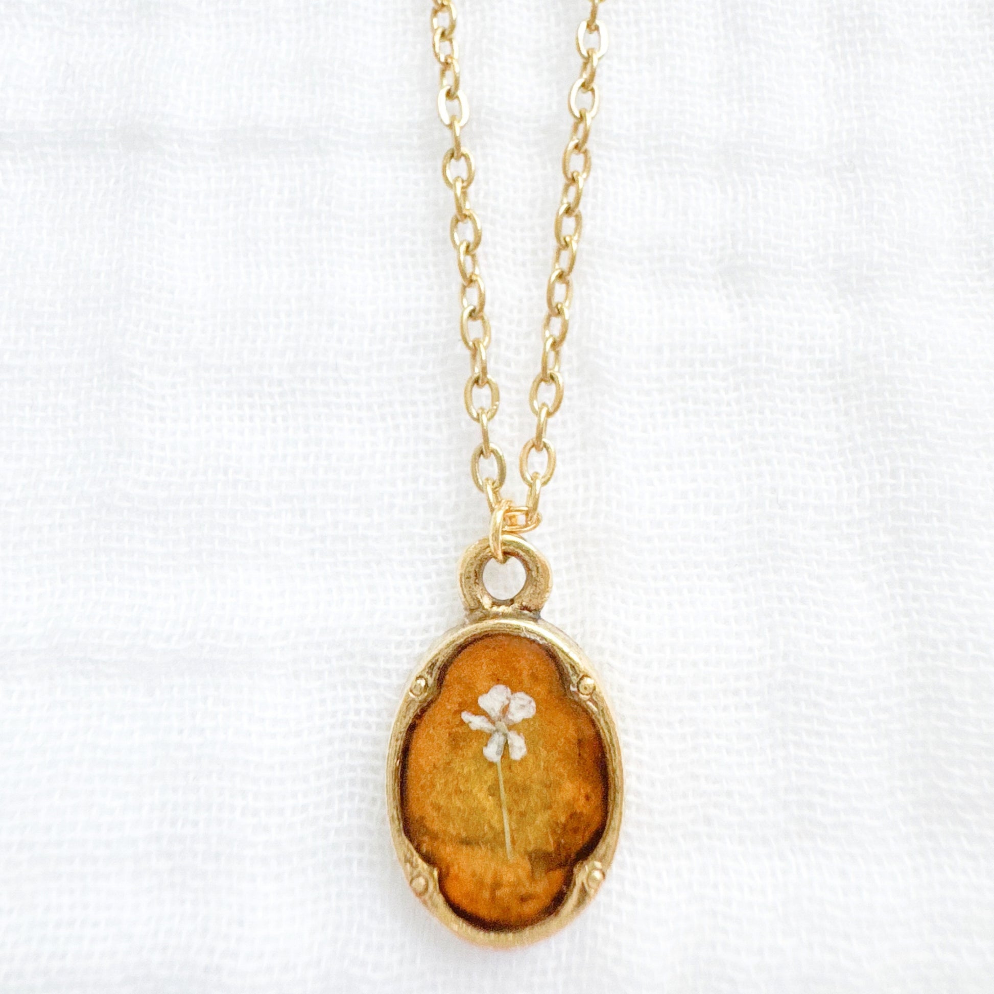 A dainty pressed flower necklace featuring a pair of delicate Queen Anne's lace cast against a golden yellow, shimmering amber backdrop. These real pressed flowers are housed in an elegant, antique style pendant.